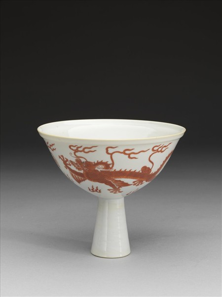 侈口窄唇,唇緣細稜凸起,深壁,高圈足,施白釉。外壁以紅彩描繪雙龍戲珠與火焰紋,碗心書「大清乾隆年製」三行六字篆款,外加雙方框。