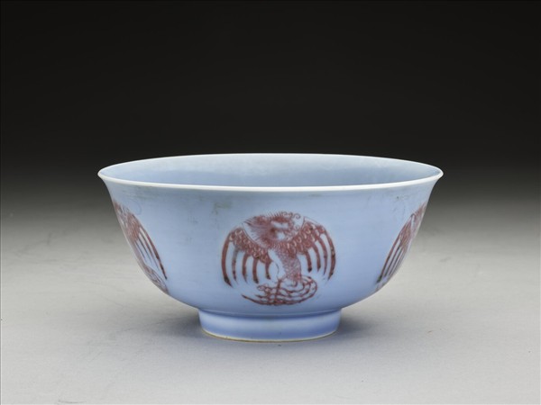 圓口,唇緣微外侈,弧形深壁,平底,矮圈足。器壁通施天藍釉,外壁裝飾五個紅彩團鳳紋,碗心亦繪一團鳳紋,鳳首、軀體與鳳尾成S型,雙翅展開於兩側,使圖案成圓形,紅彩發色呈暗紅色,帶綠色苔點。底有青花書「大清雍正年製」二行六字楷款,外加雙圈。