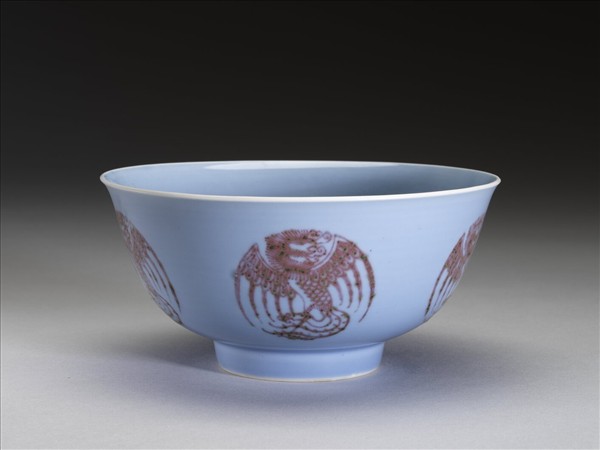 圓口,唇緣微外侈,弧形深壁,平底,矮圈足。器壁通施天藍釉,外壁裝飾五個紅彩團鳳紋,碗心亦繪一團鳳紋,鳳首、軀體與鳳尾成S型,雙翅展開於兩側,使圖案成圓形,紅彩發色呈暗紅色,帶綠色苔點。底有青花書「大清雍正年製」二行六字楷款,外加雙圈。
