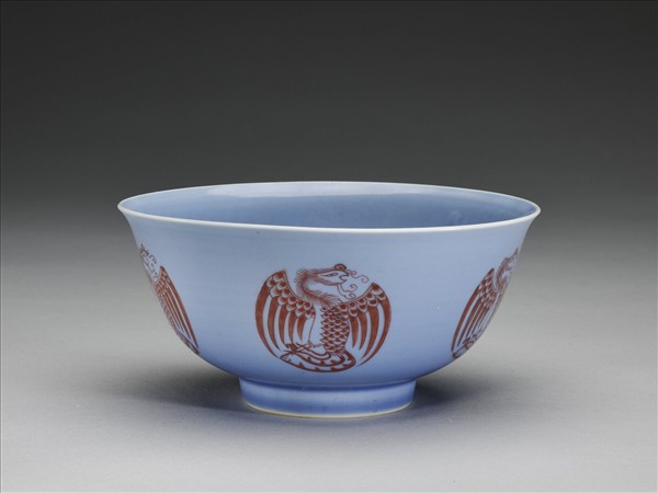 圓口,唇緣微外侈,弧形深壁,平底,矮圈足。器壁通施天藍釉,外壁裝飾五個描紅團鳳紋,碗心亦繪一團鳳紋,鳳首、軀體與鳳尾成S型,雙翅展開於兩側,使圖案成圓形,線條粗細分明。底有青花書「大清雍正年製」二行六字楷款,外加雙圈。