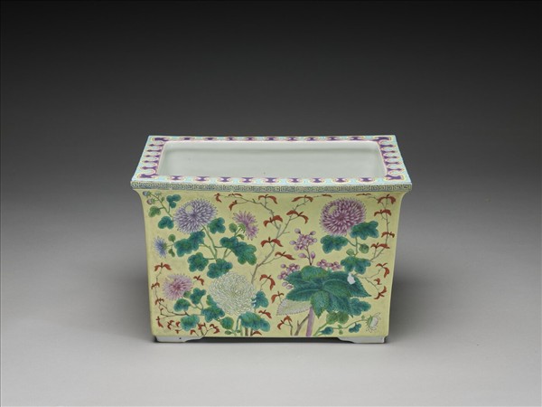 粉彩黃地花卉紋四方花盆