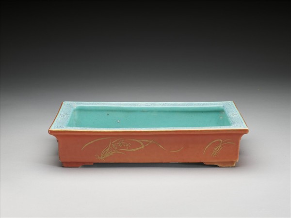 紅釉描金水仙紋四方花盆
