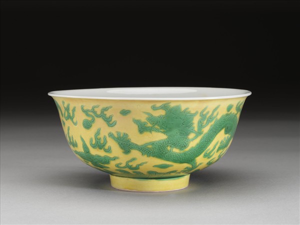 侈口微撇,深壁,圈足。外壁以黃釉為地,綠彩繪雙龍戲珠,隙間畫朵雲紋和火焰紋,底沿繪波濤紋一周。內壁施白釉,樸素無紋飾。底有青花書「大清康熙年製」二行六字楷款,外加雙圈。