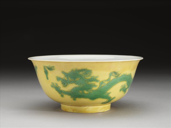 侈口微撇,深壁,圈足。外壁以黃釉為地,綠彩繪雙龍戲珠,內壁施白釉,樸素無紋飾。底有青花書「大清康熙年製」二行六字楷款,外加雙圈。