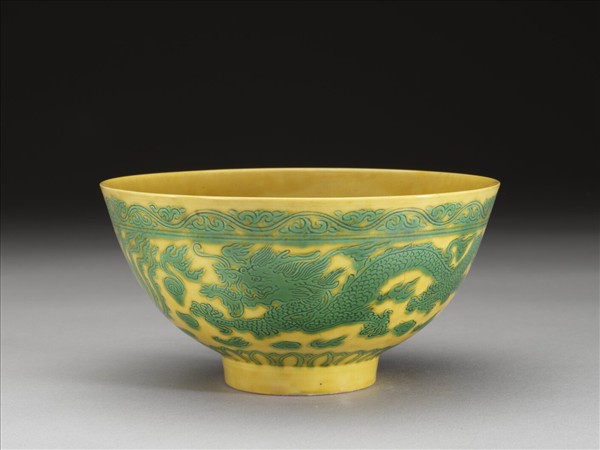 敞口,深壁,圈足。通體黃釉,紋飾以綠彩繪成。外壁繪一龍、二鳳與一鶴,隙地加飾火焰與朵雲,口沿及底沿分繪卷草紋及蓮瓣紋一周。碗心繪如意雲紋和卷草紋組成的「壽」字紋。底有青花書「大清康熙年製」二行六字楷款,外加雙圈。