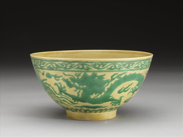 敞口,深壁,圈足。通體黃釉,紋飾以綠彩繪成。外壁繪一龍、二鳳與一鶴,隙地加飾火焰與朵雲,口沿及底沿分繪卷草紋及蓮瓣紋一周。碗心繪如意雲紋和卷草紋組成的「壽」字紋。底有青花書「大清康熙年製」二行六字楷款,外加雙圈。