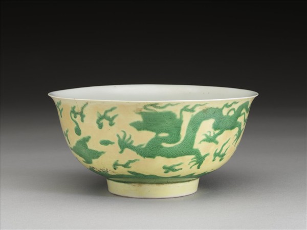 侈口微撇,深壁,圈足。外壁以黃釉為地,綠彩繪雙龍戲珠,隙間畫朵雲紋和火焰紋,底沿繪波濤紋一周。內壁施白釉,樸素無紋飾。底有青花書「大清康熙年製」二行六字楷款,外加雙圈。
