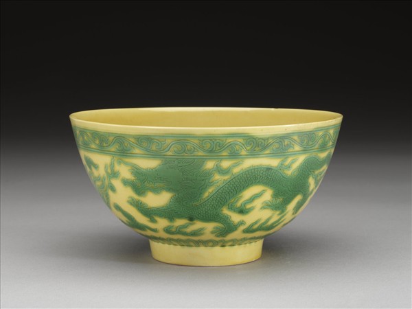 敞口,深壁,圈足。通體黃釉,紋飾以綠彩繪成。外壁繪一龍、二鳳與一鶴,隙地加飾火焰與朵雲,口沿及底沿分繪卷草紋及蓮瓣紋一周。碗心繪如意雲紋和卷草紋組成的「壽」字紋。底有青花書「大清康熙年製」二行六字楷款,外加雙圈。