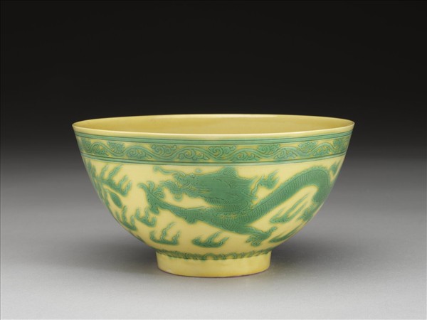 敞口,深壁,圈足。通體黃釉,紋飾以綠彩繪成。外壁繪一龍、二鳳與一鶴,隙地加飾火焰與朵雲,口沿及底沿分繪卷草紋及蓮瓣紋一周。碗心繪如意雲紋和卷草紋組成的「壽」字紋。底有青花書「大清康熙年製」二行六字楷款,外加雙圈。