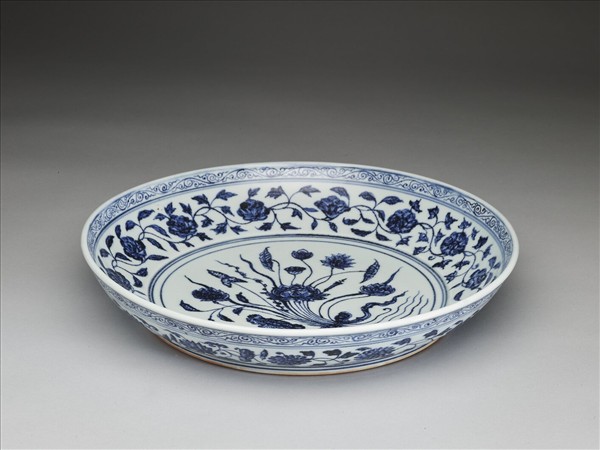 盤子弧壁,矮圈足。器底露胎,全器以青花為飾。口沿下飾卷草紋,內壁有蓮花、石榴、菊花等各式花朵共十三朵。外壁口沿下繪卷草紋,壁面畫纏枝花卉十四朵,近圈足處有回紋一周。盤心主紋飾是蓮花、慈菇等紮成的花束。因為外交往來以及貿易交換等因素,土耳其的托普卡普宮殿博物館以及伊朗的阿德卑爾神廟收藏有大量的十五世紀初期青花瓷器,類似這件作品的青花一把蓮盤,在兩大收藏中也都可以見到。