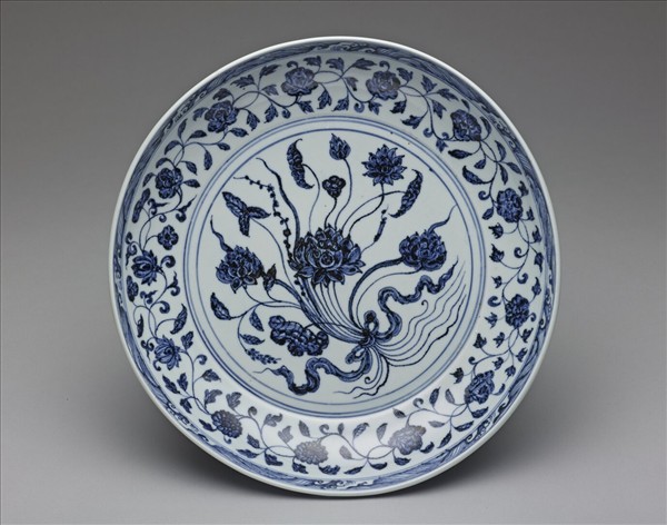 盤子弧壁,矮圈足。器底露胎,全器以青花為飾。口沿下是海水波濤紋,內壁有蓮花、石榴、菊花等各式花朵共十三朵,外壁口沿下繪卷草紋,壁面畫纏枝花卉十四朵,近圈足處有回紋一周。盤心主紋飾是蓮花、慈菇等紮成的花束。因為外交往來以及貿易交換等因素,土耳其的托普卡普宮殿博物館以及伊朗的阿德卑爾神廟收藏有大量的十五世紀初期青花瓷器,類似這件作品的青花一把蓮盤,在兩大收藏中也都可以見到。在阿德卑爾神廟收藏一件同類型盤子,器底有「青花磬口花盤一樣」及與價格相關記載的墨書,可以讓人遙想其流通海外的情景。