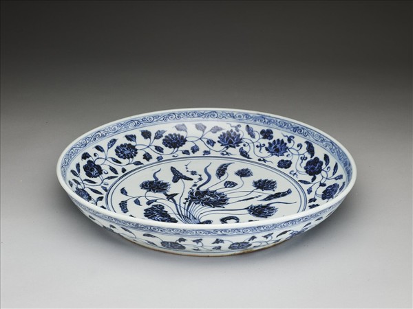 盤子弧壁,矮圈足。器底露胎,全器以青花為飾。口沿下飾卷草紋,內壁有蓮花、石榴、菊花等各式花朵共十三朵。外壁口沿下繪卷草紋,壁面畫纏枝花卉十四朵,近圈足處有回紋一周。盤心主紋飾是蓮花、慈菇等紮成的花束。因為外交往來以及貿易交換等因素,土耳其的托普卡普宮殿博物館以及伊朗的阿德卑爾神廟收藏有大量的十五世紀初期青花瓷器,類似這件作品的青花一把蓮盤,在兩大收藏中也都可以見到。