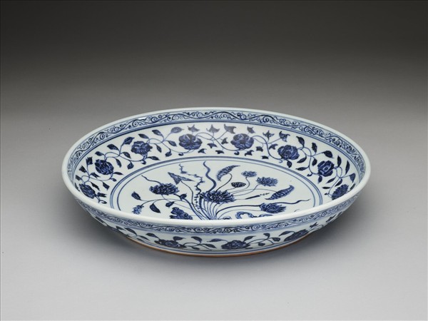 盤子弧壁,矮圈足。器底露胎,全器以青花為飾。口沿下飾卷草紋,內壁有蓮花、石榴、菊花等各式花朵共十三朵。外壁口沿下繪卷草紋,壁面畫纏枝花卉十四朵,近圈足處有回紋一周。盤心主紋飾是蓮花、慈菇等紮成的花束。因為外交往來以及貿易交換等因素,土耳其的托普卡普宮殿博物館以及伊朗的阿德卑爾神廟收藏有大量的十五世紀初期青花瓷器,類似這件作品的青花一把蓮盤,在兩大收藏中也都可以見到。