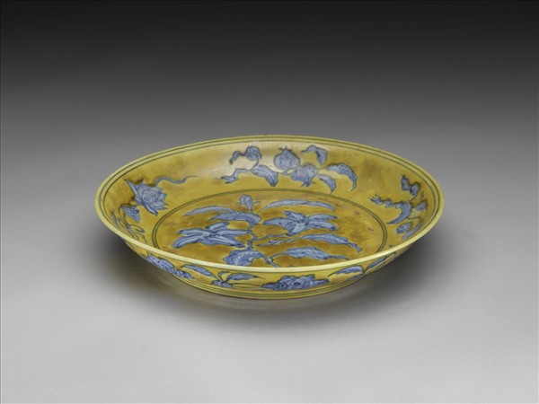 侈口窄唇,淺壁,矮圈足。內壁畫石榴、葡萄等果實四折枝,盤心畫玉蘭花一枝。外面畫轉枝牡丹花七朵。內外加飾青線十道。原為白地青花,面加黃釉一層,盤底全部露胎。外面口沿下有青花書「大明成化成製」六楷字橫款。