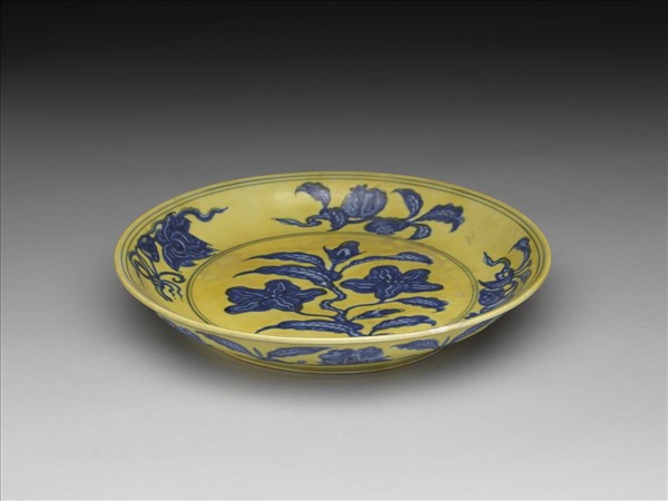 侈口窄唇,淺壁,矮圈足。內壁畫青花石榴、葡萄等四種果實,盤心畫玉蘭一枝。外壁畫轉枝牡丹花七朵。內外分畫青線十道。原為白地青花,加施黃釉一層。底有青花書「大明弘治年製」二行六字楷款,外加雙圈。