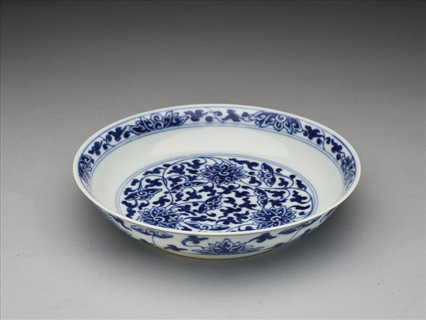侈口窄唇,淺壁,矮圈足。胎質較薄,外壁畫盛開及待開之纏枝番蓮共十二朵,盤心雙圈青線內則繪綻放之番蓮三朵與未綻番蓮七朵,內壁口沿飾番蓮紋一周。底有「大清乾隆年製」三行六字篆款。