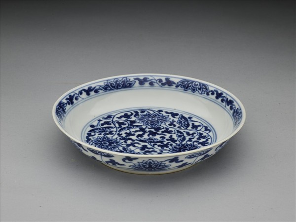 侈口窄唇,淺壁,矮圈足。胎質較薄,外壁畫盛開及待開之纏枝番蓮共十二朵,盤心雙圈青線內則繪綻放之番蓮三朵與未綻番蓮七朵,內壁口沿飾番蓮紋一周。底有「大清乾隆年製」三行六字篆款。