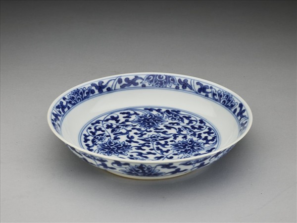 侈口窄唇,淺壁,矮圈足。胎質較薄,外壁畫盛開及待開之纏枝番蓮共十二朵,盤心雙圈青線內則繪綻放之番蓮三朵與未綻番蓮七朵,內壁口沿飾番蓮紋一周。底有「大清乾隆年製」三行六字篆款。
