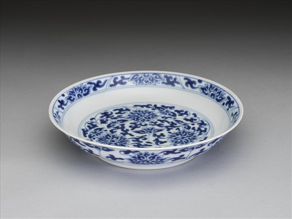 侈口窄唇,淺壁,矮圈足。胎質較薄,外壁畫盛開及待開之纏枝番蓮共十二朵,盤心雙圈青線內則繪綻放之番蓮三朵與未綻番蓮七朵,內壁口沿飾番蓮紋一周。底有「大清乾隆年製」三行六字篆款。