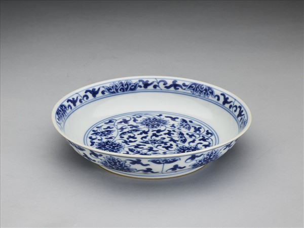 侈口窄唇,淺壁,矮圈足。胎質較薄,外壁畫盛開及待開之纏枝番蓮共十二朵,盤心雙圈青線內則繪綻放之番蓮三朵與未綻番蓮七朵,內壁口沿飾番蓮紋一周。底有「大清乾隆年製」三行六字篆款。