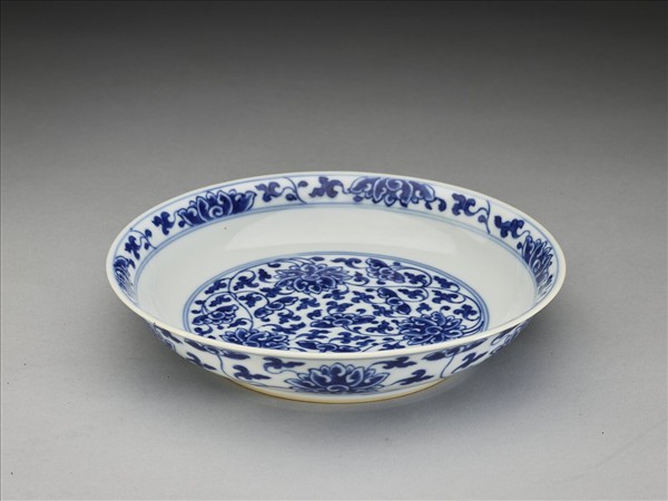 侈口窄唇,淺壁,矮圈足。胎質較薄,外壁畫盛開及待開之纏枝番蓮共十二朵,盤心雙圈青線內則繪綻放之番蓮三朵與未綻番蓮七朵,內壁口沿飾番蓮紋一周。底有「大清乾隆年製」三行六字篆款。