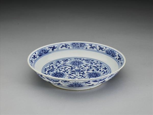 侈口窄唇,淺壁,矮圈足。胎質較薄,外壁畫盛開及待開之纏枝番蓮共十二朵,盤心雙圈青線內則繪綻放之番蓮三朵與未綻番蓮七朵,內壁口沿飾番蓮紋一周。底有「大清乾隆年製」三行六字篆款。