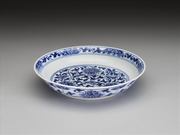 侈口窄唇,淺壁,矮圈足。胎質較薄,外壁畫盛開及待開之纏枝番蓮共十二朵,盤心雙圈青線內則繪綻放之番蓮三朵與未綻番蓮七朵,內壁口沿飾番蓮紋一周。底有「大清乾隆年製」三行六字篆款。