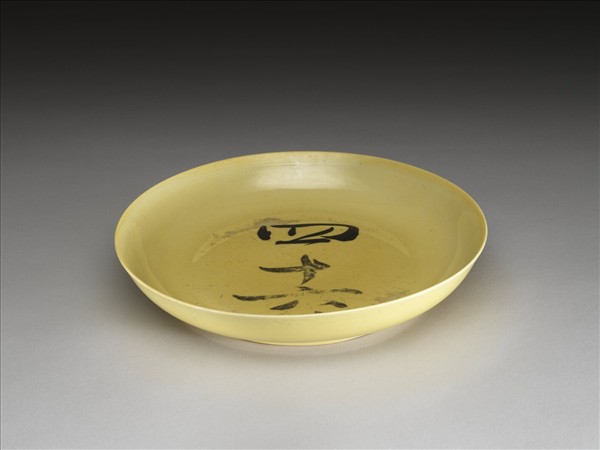 侈口,淺壁,矮圈足。胎質較薄,內外滿施嬌黃釉,盤底純白,樸素無紋飾。底有青花書「大明弘治年製」六楷字款,外加雙圈。
