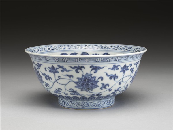 侈口窄唇,深壁,矮圈足。碗內口唇上畫轉枝菊花,周壁畫纏枝四季花五朵,碗心畫番蓮一枝。外面口沿下畫回紋一道,周壁畫纏枝番蓮五朵,底邊畫蓮瓣紋,足畫鈎雲。內外花紋間加飾青線十一道。底有青花書「大明宣德年製」六楷字款,外加雙圈。