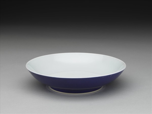 侈口,淺壁弧形,矮圈足。外壁施霽青釉,內壁、盤心及底純白,樸素無紋飾。底有青花書「大清雍正年製」六楷字款,外加雙圈。