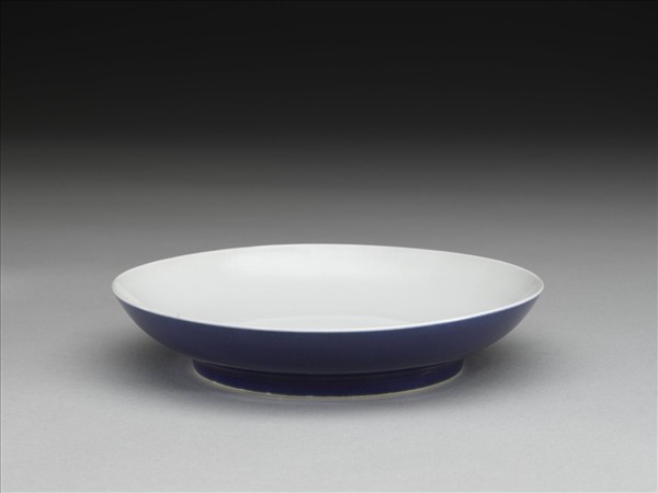 侈口,淺壁弧形,矮圈足。外壁施霽青釉,內壁、盤心及底純白,樸素無紋飾。底有青花書「大清雍正年製」六楷字款,外加雙圈。