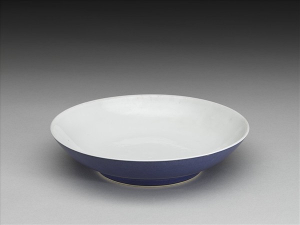 侈口,淺壁弧形,矮圈足。外壁施霽青釉,內壁、盤心及底純白,樸素無紋飾。底有青花書「大清雍正年製」六楷字款,外加雙圈。