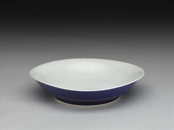 侈口,淺壁弧形,矮圈足。外壁施霽青釉,內壁、盤心及底純白,樸素無紋飾。底有青花書「大清雍正年製」六楷字款,外加雙圈。