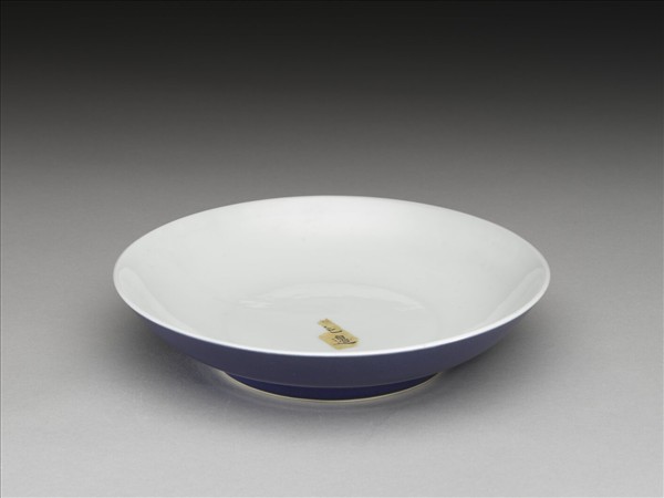 侈口,淺壁弧形,矮圈足。外壁施霽青釉,內壁、盤心及底純白,樸素無紋飾。底有青花書「大清雍正年製」六楷字款,外加雙圈。