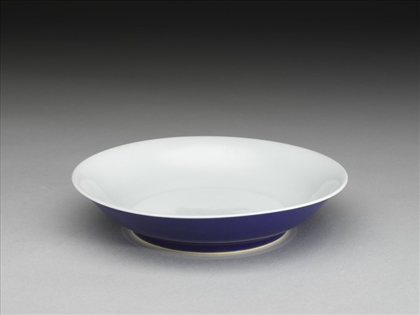 侈口,淺壁弧形,矮圈足。外壁施霽青釉,內壁、盤心及底純白,樸素無紋飾。底有青花書「大清雍正年製」六楷字款,外加雙圈。