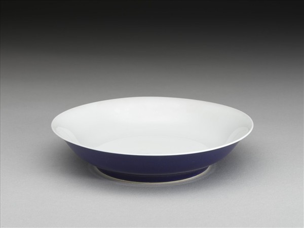 侈口,淺壁弧形,矮圈足。外壁施霽青釉,內壁、盤心及底純白,樸素無紋飾。底有青花書「大清雍正年製」六楷字款,外加雙圈。