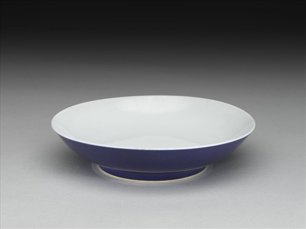 侈口,淺壁弧形,矮圈足。外壁施霽青釉,內壁、盤心及底純白,樸素無紋飾。底有青花書「大清雍正年製」六楷字款,外加雙圈。