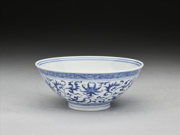 敞口,深壁,矮圈足。外壁畫番蓮五朵,口沿畫卷草紋一周,底邊畫如意雲紋一周,口足間加飾青線五道。碗內口沿畫雙線,底心畫番蓮一朵,邊加雙線。底有青花書「大清乾隆年製」三行六字篆款。