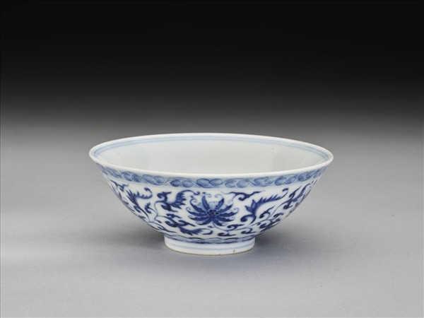 敞口,深壁,矮圈足。外壁畫番蓮五朵,口沿畫卷草紋一周,底邊畫如意雲紋一周,口足間加飾青線五道。碗內口沿畫雙線,底心畫番蓮一朵,邊加雙線。底有青花書「大清乾隆年製」三行六字篆款。