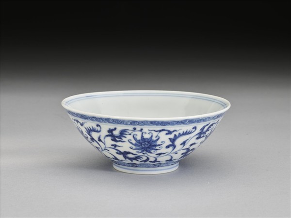 敞口,深壁,矮圈足。外壁畫番蓮五朵,口沿畫卷草紋一周,底邊畫如意雲紋一周,口足間加飾青線五道。碗內口沿畫雙線,底心畫番蓮一朵,邊加雙線。底有青花書「大清乾隆年製」三行六字篆款。