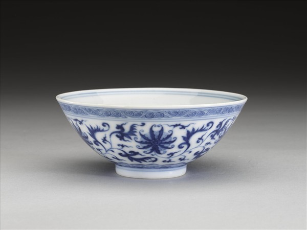 敞口,深壁,矮圈足。外壁畫番蓮五朵,口沿畫卷草紋一周,底邊畫如意雲紋一周,口足間加飾青線五道。碗內口沿畫雙線,底心畫番蓮一朵,邊加雙線。底有青花書「大清乾隆年製」三行六字篆款。