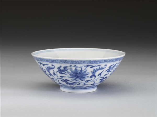 敞口,深壁,矮圈足。外壁畫番蓮五朵,口沿畫卷草紋一周,底邊畫如意雲紋一周,口足間加飾青線五道。碗內口沿畫雙線,底心畫番蓮一朵,邊加雙線。底有青花書「大清乾隆年製」三行六字篆款。