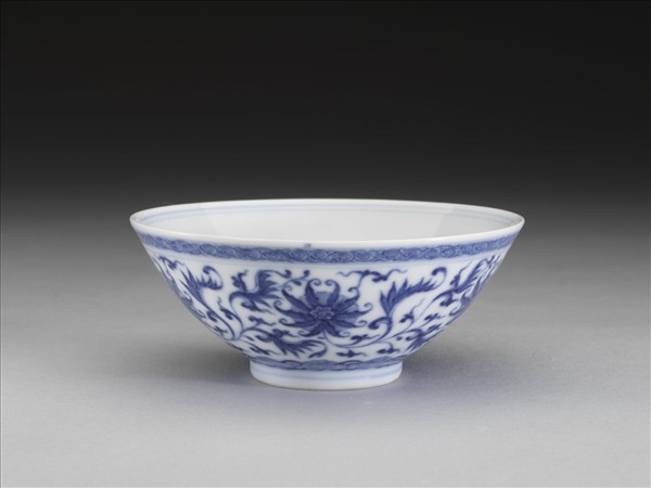 敞口,深壁,矮圈足。外壁畫番蓮五朵,口沿畫卷草紋一周,底邊畫如意雲紋一周,口足間加飾青線五道。碗內口沿畫雙線,底心畫番蓮一朵,邊加雙線。底有青花書「大清乾隆年製」三行六字篆款。