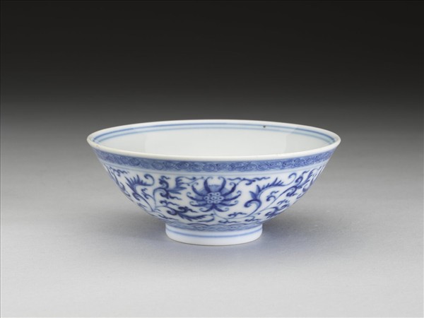 敞口,深壁,矮圈足。外壁畫番蓮五朵,口沿畫卷草紋一周,底邊畫如意雲紋一周,口足間加飾青線五道。碗內口沿畫雙線,底心畫番蓮一朵,邊加雙線。底有青花書「大清乾隆年製」三行六字篆款。
