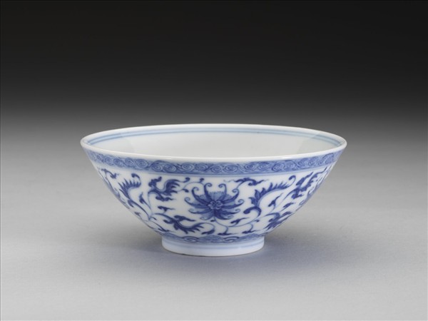 敞口,深壁,矮圈足。外壁畫番蓮五朵,口沿畫卷草紋一周,底邊畫如意雲紋一周,口足間加飾青線五道。碗內口沿畫雙線,底心畫番蓮一朵,邊加雙線。底有青花書「大清乾隆年製」三行六字篆款。