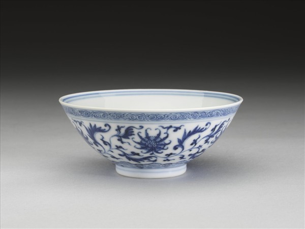 敞口,深壁,矮圈足。外壁畫番蓮五朵,口沿畫卷草紋一周,底邊畫如意雲紋一周,口足間加飾青線五道。碗內口沿畫雙線,底心畫番蓮一朵,邊加雙線。底有青花書「大清乾隆年製」三行六字篆款。