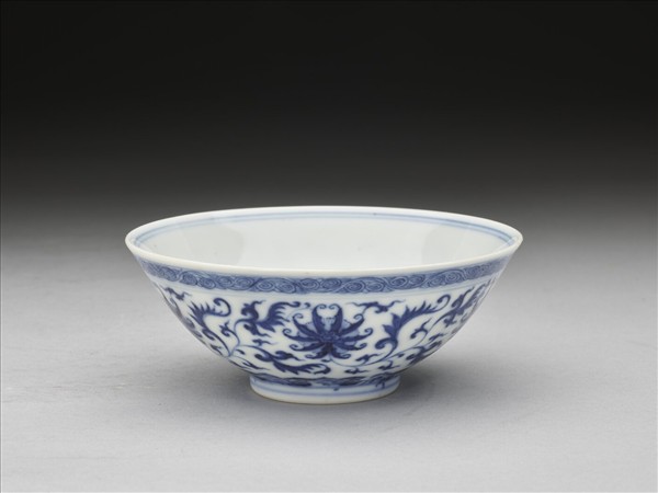敞口,深壁,矮圈足。外壁畫番蓮五朵,口沿畫卷草紋一周,底邊畫如意雲紋一周,口足間加飾青線五道。碗內口沿畫雙線,底心畫番蓮一朵,邊加雙線。底有青花書「大清乾隆年製」三行六字篆款。