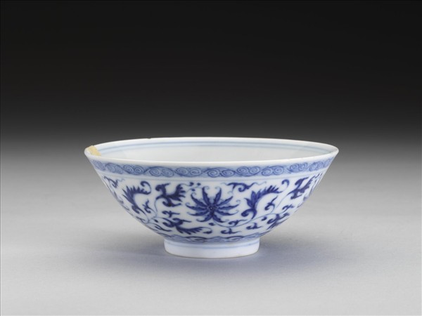敞口,深壁,矮圈足。外壁畫番蓮五朵,口沿畫卷草紋一周,底邊畫如意雲紋一周,口足間加飾青線五道。碗內口沿畫雙線,底心畫番蓮一朵,邊加雙線。底有青花書「大清乾隆年製」三行六字篆款。