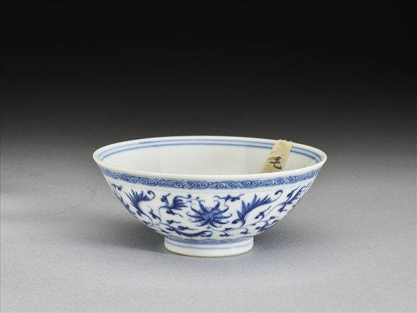 敞口,深壁,矮圈足。外壁畫番蓮五朵,口沿畫卷草紋一周,底邊畫如意雲紋一周,口足間加飾青線五道。碗內口沿畫雙線,底心畫番蓮一朵,邊加雙線。底有青花書「大清乾隆年製」三行六字篆款。
