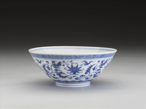 敞口,深壁,矮圈足。外壁畫番蓮五朵,口沿畫卷草紋一周,底邊畫如意雲紋一周,口足間加飾青線五道。碗內口沿畫雙線,底心畫番蓮一朵,邊加雙線。底有青花書「大清乾隆年製」三行六字篆款。